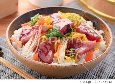 てこね寿司風(カツオ刺身しょうゆ漬け)イメージ。ぱぱ〜んアレンジのオリジナル創作料理。