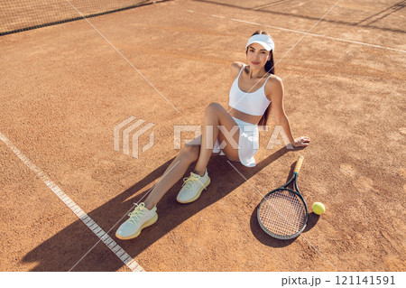 Pretty young tennis player in white clothes sitting on the tennis courts