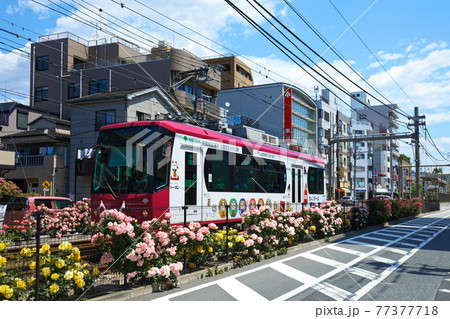 都電沿線のカラフルなバラの花と路面電車 宝くじ号