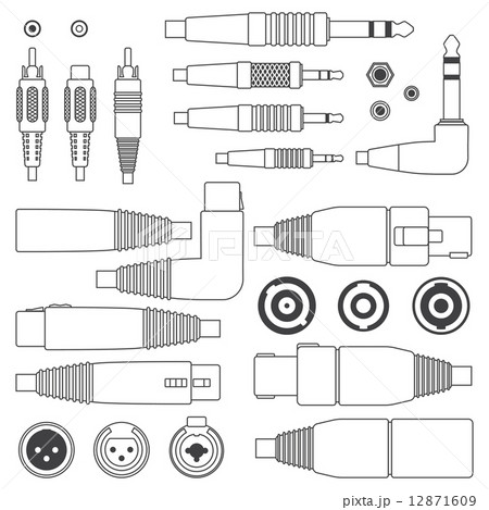 Connector and ports. USB type A and type C, video ports hand drawnMI DVI and Displayport, audio coaxial, thunderbolt and lightning vector ports