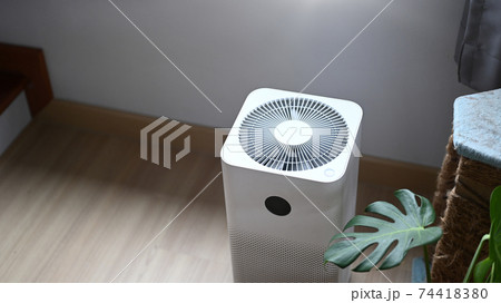 Air purifier in comfortable living room with house plant on the wooden floor.