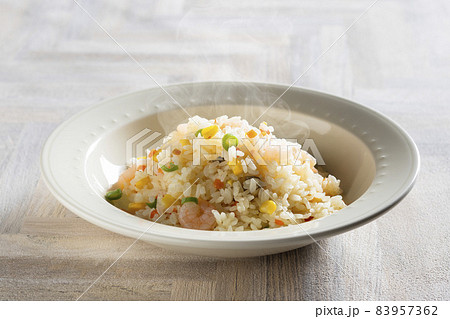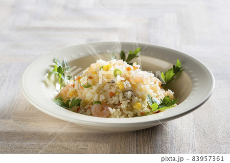 お皿にのせた エビピラフ クローズアップ 白背景