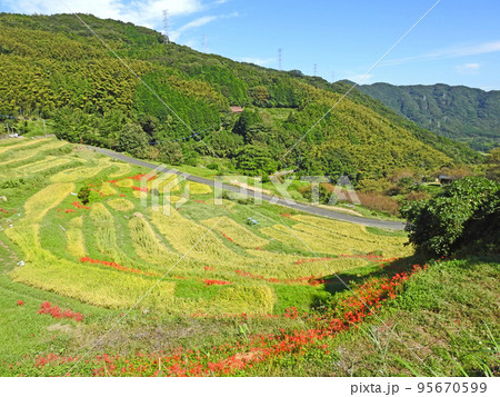 彼岸花咲く農村景観百選の福岡県等覚寺の棚田の稲刈り