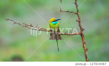 Asian green bee-eater rests on a thorny branch, iridescent feathers glowing against the soft green backdrop of Yala National Park, Sri Lanka