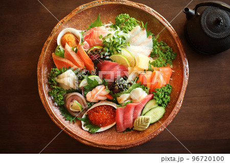 鮪やサーモン、きゅうりやとびこなどが入った海鮮丼(白背景)