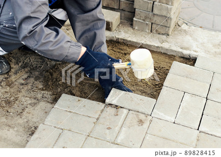 Construction worker is installing arranging precast concrete pavers stones for road sidewalk at construction site