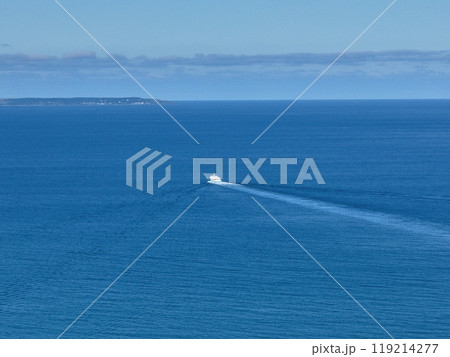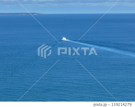 【空から見た北海道・羽幌】 穏やかな海にきれいな航跡を描いて航行するフェリー