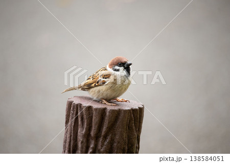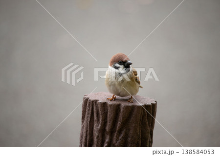 止まり木の上でたたずむスズメ