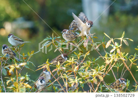 アンテナにとまるスズメの群れ Sparrow birds on antenna