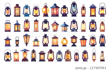 Cartoon camping lantern set. Vintage hiking oil gasoline rustic lamp, adventure travel equipment vector illustration