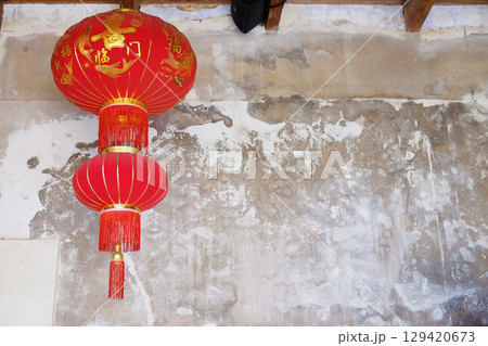 Beautiful of red Chinese paper lantern with Chinese characters hanging wooden ceiling and White dirty grunge and rough concrete wall on Chinese New Year holiday