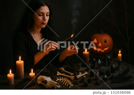 Young woman performing halloween altar ritual with candles, incense, and jack-o-lantern in dark room. concept of spiritual ceremony, autumn celebration, mystical ambiance