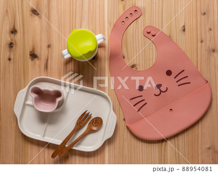写真素材|離乳食のエプロンと食器のセット 子ども