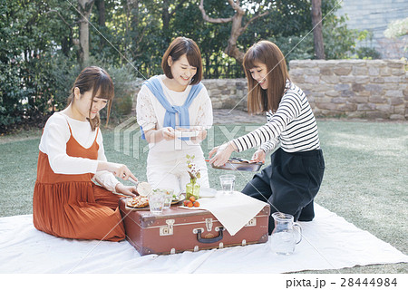 屋外で作った焼きそばを取り分ける男女 アウトドアイメージ