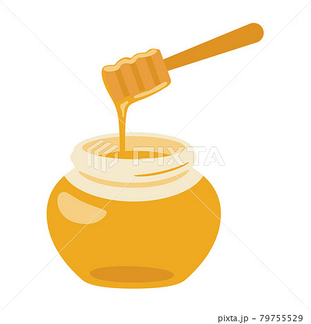 蜂蜜のイラスト。ハニーディッパーと、瓶に入った金色のはちみつ。