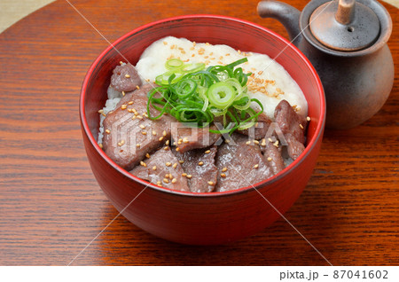 牛タンとろろ丼。牛タン焼き肉+長芋とろろのご飯丼。ネギを添えて。