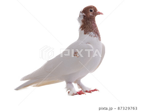 Colorful pigeon with iridescent feathers standing gracefully on a white background