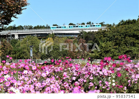 ジブリパークに咲き誇るコスモスとリニアモーターカー