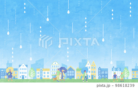 雨が降る街並みと人々のベクターイラスト背景