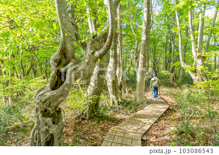 中島台・獅子ヶ鼻湿原の春 奇形巨木ブナ 散策路 木道