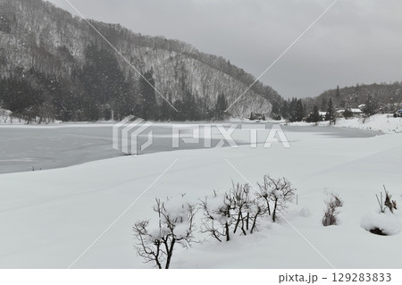 小雪降る正月2日、長野県大町市中綱(なかつな)湖の雪景色を撮る
