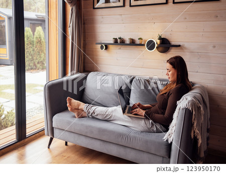 A young woman in casual loungewear relaxes on the sofa and working on her laptop. The lady is comfortably sitting with her legs stretched out and making online purchases at home.