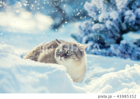 Siamese cat outdoors. Cat sneaking in the deep snow in winter
