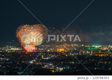 夏の風物詩 花火大会風景 阿蘇郡の展望から観える熊本市街地夜景と江津湖花火大会風景