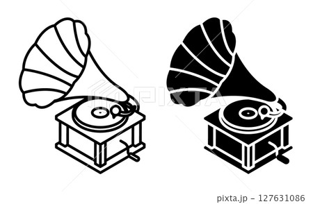 Linear icon, isometric gramophone, old device for playing sound. Large metal horn and base, rotating platform for vinyl. Simple black and white top view vector isolated on white background