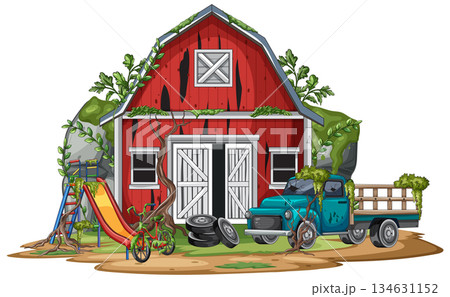 Abandoned Red Barn with Overgrown Vegetation and Old Truck