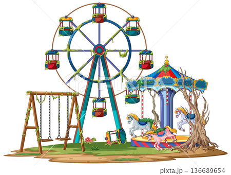 Abandoned Colorful Amusement Park With Rusty Ferris Wheel