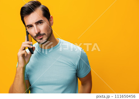 Man smartphone smiling studio happy cyberspace space phone phone portrait communication mobile copy yellow