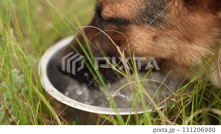 loving bond between dog and owner, Cooling refreshment in the wild, German Shepherd drinks water outside, Pouring water from a bottle, Pet care during adventures, Summer day hydration, Dog s grateful