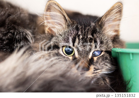 Detailed depiction of attentive domestic cat with textured fur and relaxed background environment