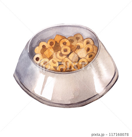 Watercolor illustration. Metal cup, plate with dry pet food hand painted with watercolor. For printing on fabric, paper, for packaging design, pet accessories.