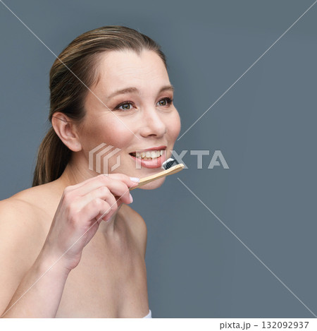 Caucasian female adult brushing teeth with eco-friendly bamboo toothbrush