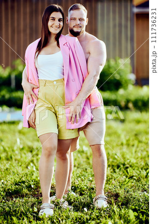 Summer photo session of married couple near country house, white young people are standing in garden.