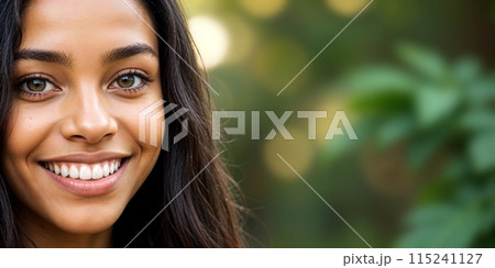 banner with close-up young, healthy, happy, beautiful, dark-skinned, mulatto woman, smiling, looking at the camera among the trees, on blurred, green, natural, sunny, vegetative copy space background