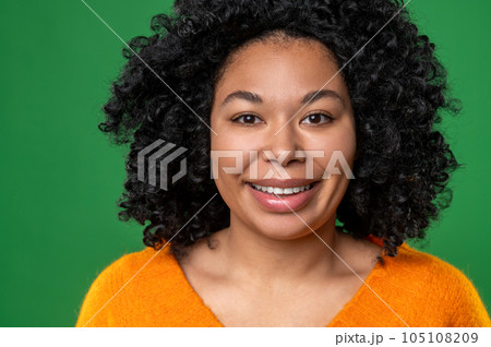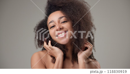 Beautiful African American woman with curly afro hairstyle and clean, healthy skin turns her head to the sides, waving her hair and touching it, smiling with a bright toothy smile