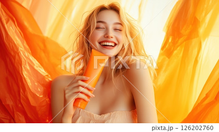 European girl enjoys summer vibes while smiling and promoting sunscreen in a bright and colorful setting, perfect for an advertising campaign with energetic lighting