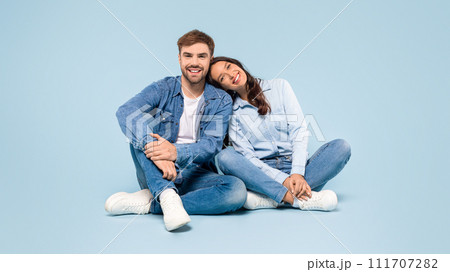 Smiling African couple in casual wear leaning against blue wall outdoors. Concept of love, happiness and relationship