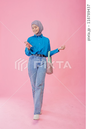 A Stylish Young Woman Dressed in a Blue Top and Denim Jeans Poses Against a Bright Pink Background