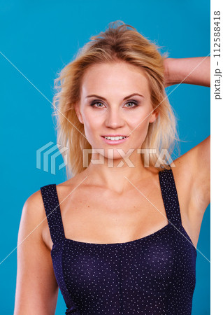 Happy calm woman smiling friendly, glad expression, feel satisfied concept good news, celebrate win