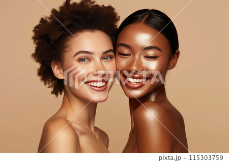 three young women smiling brightly, standing close together outdoors. They have glowing skin and shiny hair, and the natural lighting creates a vibrant, warm atmosphere, highlighting their joy and