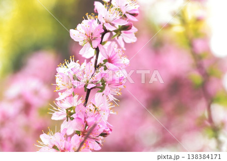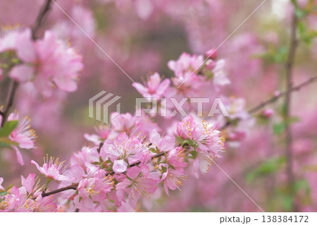 ピンクの小さな花を満開に枝いっぱい付けたニワウメのアップ