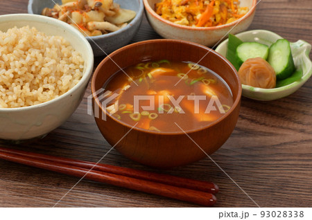 玄米ご飯、赤だし味噌汁、和食、和風、日本食、健康食、おかず、お惣菜、野菜料理、漬物、一汁三菜。
