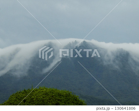 山ひだに沿って流れる雨雲の幻想的な風景の写真