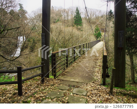 春の秋田県 金峰神社境内にあるねがい橋から奈曽の白滝を望む