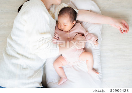 新生児の赤ちゃん 腕枕で添い寝 あくび
