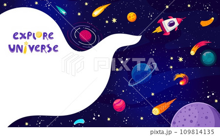 Cartoon universe landscape, galaxy stars and planets with comets, asteroids and space rocket, vector background. Outer space adventure and galaxy sky exploration with spaceship in spaceflight